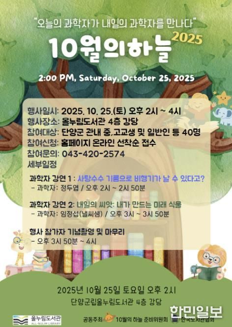 한민일보 서울포커스 김다남 기자 | 충북 단양군립올누림도서관은 오는 25일 오후 2시부터 4시까지 과학자들의 재능기부로 진행되는 ‘10월의 하늘’ 과학 행사를 운영한다고 밝혔다.