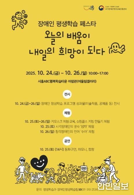 한민일보 서울포커스 유현민 기자 | 시흥시는 오는 10월 24일부터 26일까지 3일간, 시흥ABC행복학습타운 아람관과 어울터 일원에서 ‘2025 장애인 평생학습 페스타’를 개최한다.