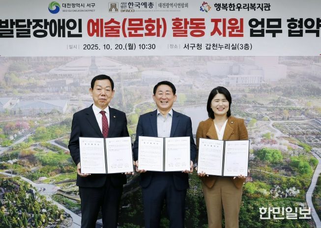 한민일보 서울포커스 김윤희 기자 | 대전 서구는 발달장애인 문화예술 활동 지원을 위해 (사)한국예총 대전광역시연합회 및 행복한우리복지관과 3개 기관 업무협약을 체결했다고 20일 전헀다.
