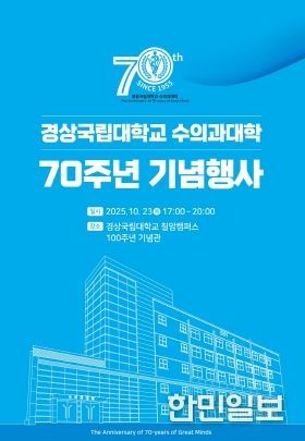 경상국립대학교 수의과대학은 설립 70주년을 맞이하여 70년 개척의 역사를 바탕으로 미래 100년을 향한 새로운 비상을 기념하기 위해, 10월 23일 오후 5시 칠암캠퍼스 100주년 기념관에서 ‘70년 개척의 자부심, 100년을 향한 새로운 비상’이라는 슬로건으로 ‘경상국립대학교 수의과대학 70주년 기념행사’를 개최한다.
