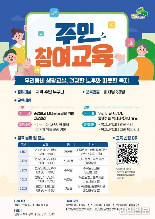 한민일보 서울포커스 임광현 기자 | 서울 은평구는 주민 참여 교육 ‘우리동네 생활 교실, 건강한 노후와 따뜻한 복지’를 운영하고 신청자를 모집한다고 밝혔다.