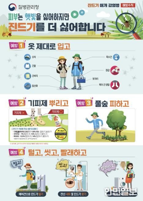 아울러, 야외활동 후 2주 이내에 발열, 두통, 구토, 설사 등 증상이 나타날 경우에는 지체하지 말고 즉시 의료기관을 방문해 진료를 받을 것을 강조했다.
