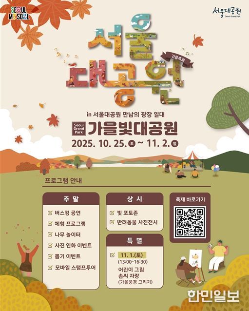 한민일보 서울포커스 국용호 기자 | 서울대공원 2025년 가을단풍축제 ‘가을빛대공원’이 10월 25일부터 11월 2일까지 서울대공원 일대에서 개최된다. 공원 전체를 가을빛으로 물들인 형형색색의 단풍을 즐길 수 있는 절호의 기회이다.