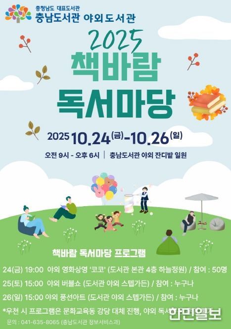 한민일보 서울포커스 박덕환 기자 | 충남도서관은 오는 24∼26일 충남도서관 일원에서 ‘2025 책바람 독서마당’ 야외도서관 행사 및 문화 프로그램을 진행한다고 23일 밝혔다.