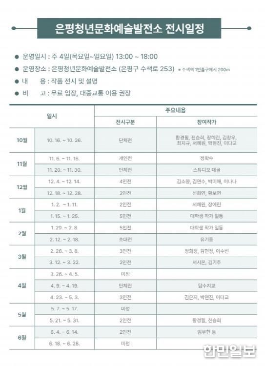 전시는 은평청년문화예술발전소에서 매주 목요일부터 일요일, 오후 1시부터 6시까지 진행되며, 방문객들은 누구나 자유롭게 관람할 수 있다. 특히 매달 2~3회 전시회가 변경돼 새로운 작품들이 계속해서 선보일 예정이니, 은평구민들의 많은 관심과 방문을 바란다.