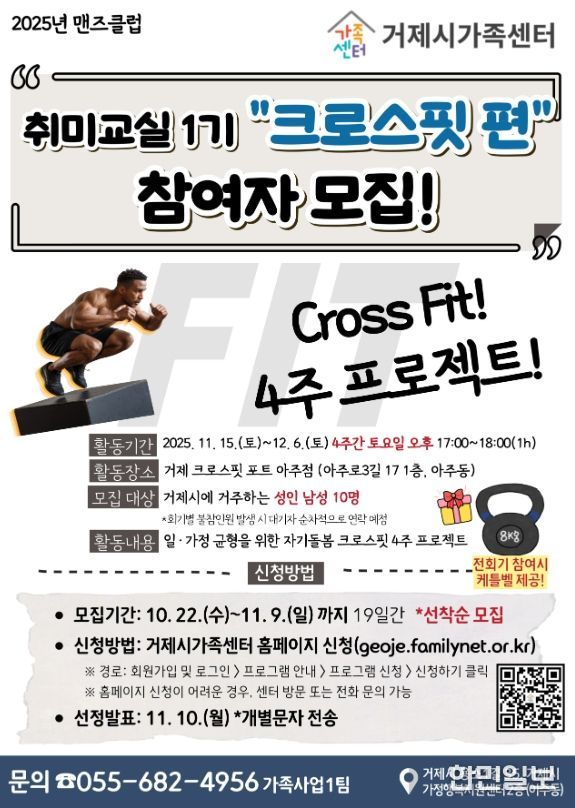 한민일보 서울포커스 임광현 기자 | 거제시가족센터(센터장 류주진)는 2025년 맨즈클럽 취미교실 1기 ‘크로스핏 편’ 참여자를 모집한다.