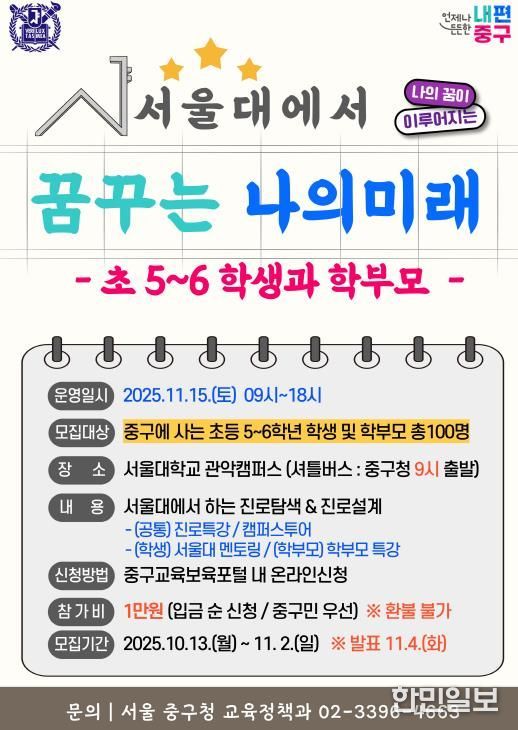 한민일보 서울포커스 김서윤 기자 | 서울 중구가 오는 11월 15일과 22일, 서울대학교 관악캠퍼스에서 관내 초·중학생 및 학부모를 대상으로 하는 '2025 서울대연계 진로심화 프로그램 '꿈꾸는 나의 미래''를 운영한다.