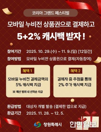 한민일보 서울포커스 김서윤 기자 | 창원특례시는 오는 10월 29일부터 11월 9일까지 12일간, ‘코리아 그랜드 페스티벌’ 기간에 맞춰 모바일 창원사랑상품권 ‘누비전’ 결제 시 최대 7% 캐시백을 제공하는 특별 이벤트를 진행한다고 24일 밝혔다.