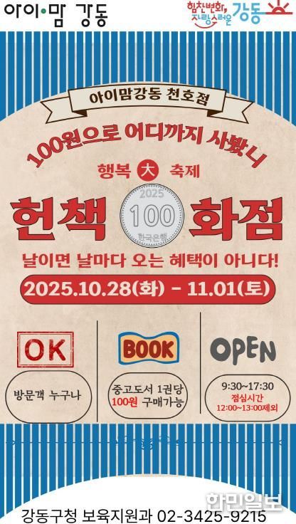 한민일보 서울포커스 박정민 기자 | 강동구는 아이맘 강동 천호점 내 장난감 도서관에서 대여됐던 도서 중 상태가 양호한 책을 권당 100원에 판매하는 ‘헌책 100화점’ 행사를 개최한다고 27일 밝혔다.