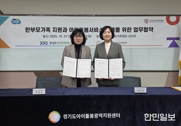 한민일보 서울포커스 김윤이 기자 | 경기도여성가족재단 내 경기도아이돌봄광역지원센터는 27일 경기남부한부모가족지원거점기관과 한부모가족 지원 및 아이돌봄서비스 연계 강화를 위한 업무협약을 체결했다.