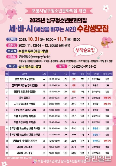 한민일보 서울포커스 김윤희 기자 | 포항시청소년재단은 27일 남구 청소년문화의집 개관을 기념해 ‘세·바·시(세상을 바꿀 시간)’ 프로그램 수강생을 모집한다고 밝혔다.