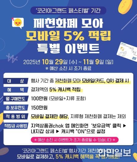 한민일보 서울포커스 김다남 기자 | 제천시가 오는 10월 29일부터 11월 9일까지 12일간 진행되는 ‘코리아 그랜드 페스티벌’에 맞춰 제천화폐 모아 모바일 결제 시 5%를 적립해주는 특별 이벤트를 실시한다고 밝혔다.