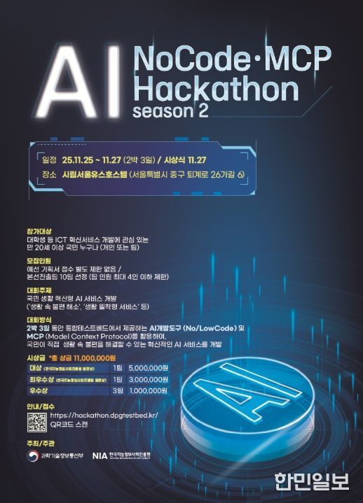 한민일보 서울포커스 기자 | 과학기술정보통신부가 주최하고 한국지능정보사회진흥원(원장 황종성,)이 주관하는 “인공지능(AI) 노코드 끝장 개발대회(해커톤) 2025” 대회가 오는 11월 25일부터 27일까지 서울 유스호스텔(중구 소재)에서 개최된다.