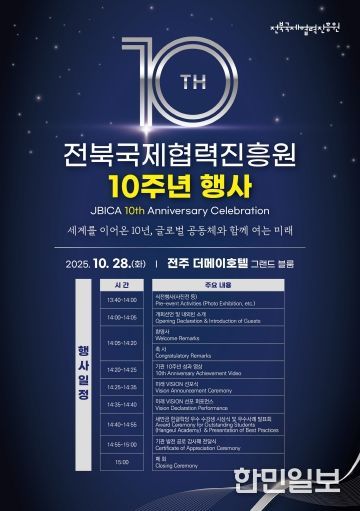 한민일보 서울포커스 임철현 기자 | 전북국제협력진흥원은 10월 28일 전주 더메이 호텔에서 창립 10주년 기념행사를 성황리에 개최하고, 향후 10년을 이끌어갈 ‘VISION 2035’를 공식 선포했다.