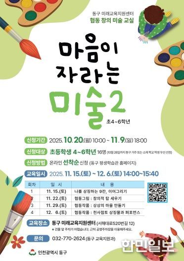 한민일보 서울포커스 백진욱 기자 | 인천 동구 미래교육지원센터는 관내 초등학생의 창의력과 공동체 역량, 세계시민으로서의 소통 역량을 함양하기 위해 ‘협동 창의 미술교실’과 ‘원어민 영어교실’을 운영한다고 밝혔다.