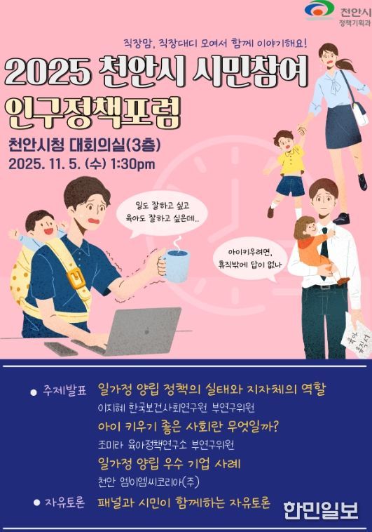 한민일보 서울포커스 황준형 기자 | 천안시는 다음 달 5일 시청 대회의실에서 ‘2025 천안시 시민참여 인구정책포럼’을 개최한다.