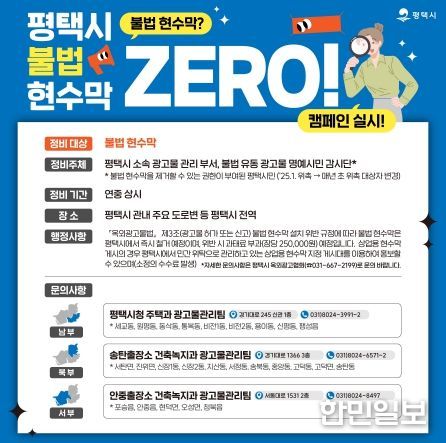 한민일보 서울포커스 황준형 기자 | 평택시는 불법 현수막 근절을 위해 ‘불법 현수막 ZERO!’ 캠페인을 전개하고, 강력한 단속 활동에 나선다고 밝혔다.