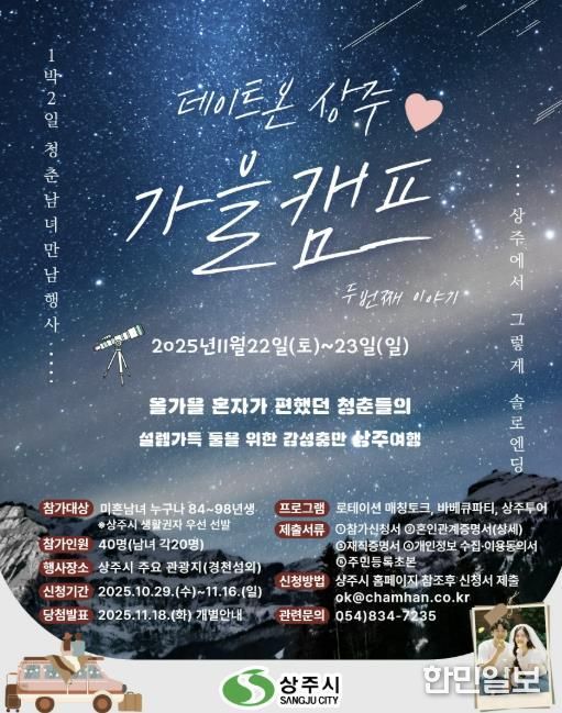 한민일보 서울포커스 김봉순 기자 | 상주시는 다음달 22일~23일 1박2일간 관내 주요 관광지 일원에서 미혼남녀 만남사업 “데이트 온 상주-시즌2 가을캠프”를 개최한다고 밝혔다.