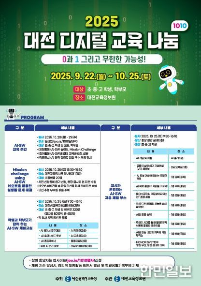 한민일보 서울포커스 유한희 기자 | 대전교육정보원은 ‘0과 1 그리고 무한한 가능성’을 주제로 ‘2025년 대전 디지털 교육 나눔1010’ 행사를 9월 22일부터 10월 28일까지 5주간 초·중·고 학생, 교원, 학부모를 대상으로 다채로운 온·오프라인 프로그램을 기획하여 성황리에 운영했다고 밝혔다.