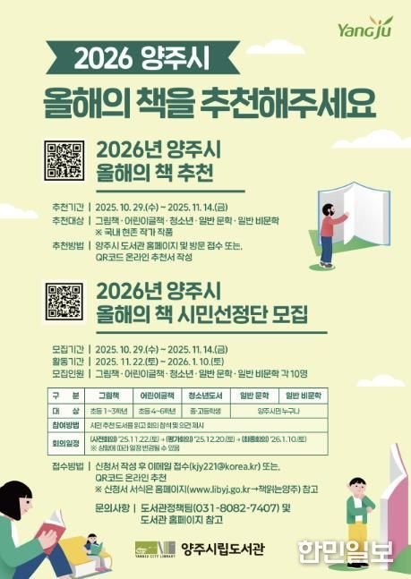 양주시 관계자는 “올해의 책을 통해 시민들이 함께 읽고 소통하며 독서의 가치와 즐거움을 느낄 수 있길 바란다”며, “2026년 양주시 올해의 책 추천에 시민 여러분의 적극적인 관심과 참여를 부탁드린다”고 전했다.
