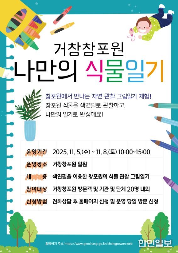 한민일보 서울포커스 김서윤 기자 | 거창창포원은 ‘국화 예술속 정원산책’ 행사 기간 중앙광장에서 방문객을 대상으로 체험 프로그램인 ‘나만의 식물일기’를 운영한다.