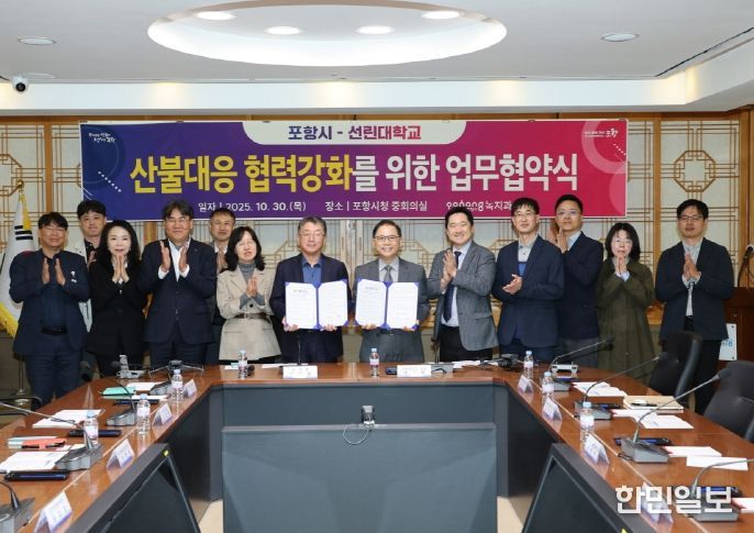 한민일보 서울포커스 최성훈 기자 | 포항시는 30일 시청 중회의실에서 선린대학교와 산불 감시·예방 전문인력 양성 및 드론 기반 산불 대응체계 구축을 위한 업무협약을 체결했다.