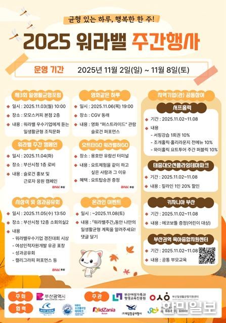 한민일보 서울포커스 임광현 기자 | 부산시는 일·생활 균형 문화를 확산해 '워라밸 행복도시 부산'을 만들기 위한 '2025년 부산 워라밸 주간'을 오는 11월 2일부터 8일까지 운영한다고 밝혔다.