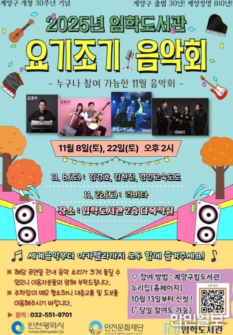 한민일보 서울포커스 김성혜 기자 | 인천 계양구 임학도서관(관장 권경회)에서 지역 주민을 대상으로 ‘요기조기 음악회’를 개최한다.