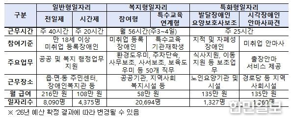 2026년 장애인일자리 지원사업(정부예산안 기준)은 2025년 3만 3,546명 대비 2,300명 확대된 3만 5,846명이며, 일반형일자리(전일제, 시간제), 복지형일자리, 특화형일자리(시각장애인안마사 파견, 발달장애인요양보호사 보조) 3개 유형으로 구분하여 시행하고 있다.
