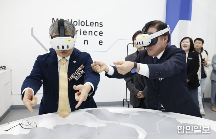 진 구청장은 정근식 서울시교육감과 함께 가상 공간에서 건물과 물건을 자유자재로 배치해 보는 ‘MR(혼합현실) 홀로렌즈’, 드론비행 등을 체험했다.