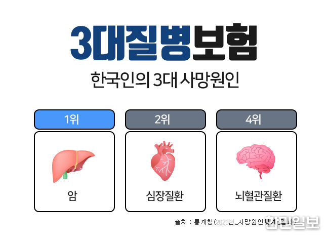 한민일보 서울포커스 박덕환 기자 | 흔히 3대질병이라 일컫는 암, 심혈관질환, 뇌혈관질환은 통계청 발표자료에 따르면 한국인의 주요 사망원인 중에서 3위 폐렴을 제외하고 1~4위를 차지하고 있으며, 이전부터 지금까지도 살면서 가장 먼저 대비해야 하는 치명적인 질병으로 강조되고 있다. 이러한 중대질병에 대비하기 위하여 상기 세가지 치명적인 질병을 집중보장하는 3대질병진단비보험을 많이 가입하고 있다. 3대진단비보험은 각각의 질병을 중점적으로 보장하면서도 가입자 특성에 맞는 특약을 추가함으로써 종합건강보험으로도 활용할 수가 있다.