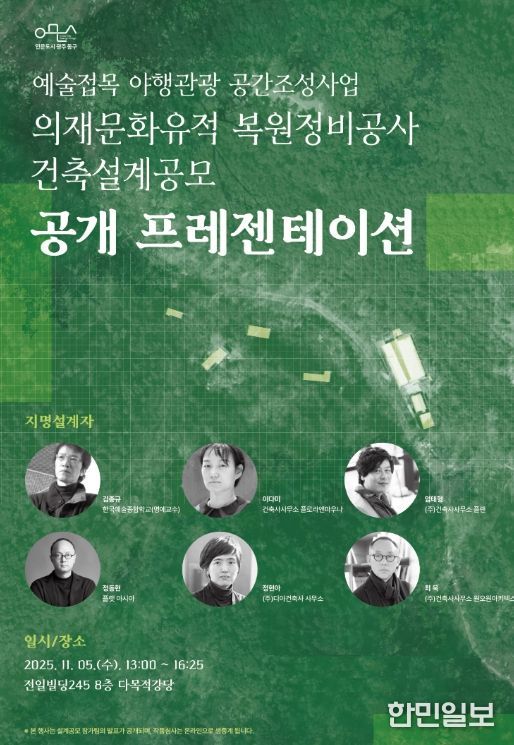 한민일보 서울포커스 박용남 기자 | 광주 동구는 오는 5일 전일빌딩 245 다목적 강당에서 무등산 의재문화유적 복원 정비를 위한 설계공모작품 공개 발표회를 열고 국내 대표 건축가 6인(팀)의 설계안을 살피는 시간을 가진다고 밝혔다.
