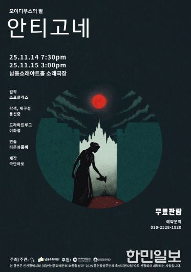 한민일보 서울포커스 김성혜 기자 | 인천시 남동구 남동문화재단은 극단 아토(대표 이종민)의 ‘오이디푸스의 딸 '안티고네'’ 공연이 11월 14~15일 이틀간 남동소래아트홀 소래극장에서 개최된다고 5일 전했다.