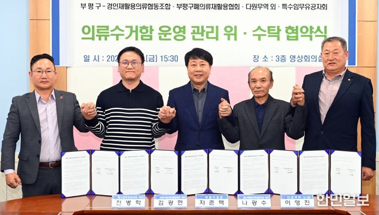 한민일보 서울포커스 김성혜 기자 | 부평구는 7일 민간단체 4곳(경인재활용의류협동조합 등) 과 함께 ‘의류수거함 운영·관리 위수탁 협약’을 맺었다고 밝혔다.