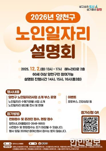 행사 참여를 원하는 어르신은 이달 21일까지 양천시니어클럽 또는 QR코드를 통해 사전 신청할 수 있으며, 행사 당일 현장 접수도 가능하다.