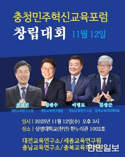 한민일보 서울포커스 박덕환 기자 | 충남교육연구소(소장 이병도) 충북교육의미래(대표 김성근) 대전교육연구소(소장 성광진), 세종교육연구원(원장 임전수) 등 대전·세종·충남·충북의 충청권 4개 교육연구기관은 교육의 본질을 회복하고 민주적 교육자치를 실현하기 위해 ‘충청민주혁신교육포럼’을 오는 12일 공식 창립한다고 밝혔다.