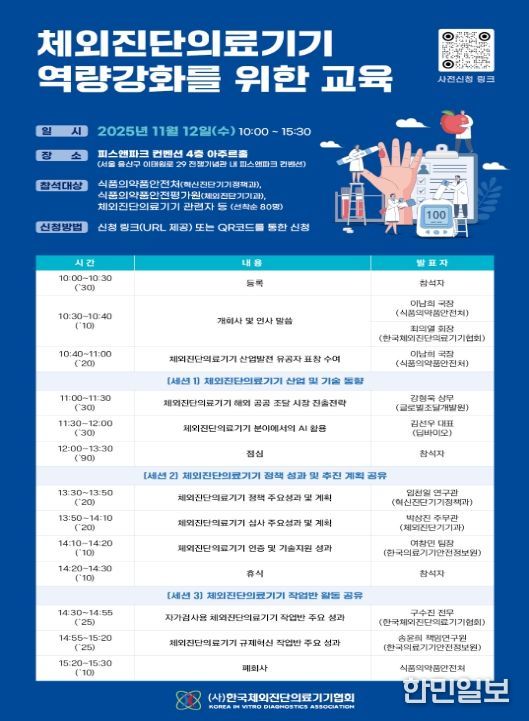 한민일보 서울포커스 임광현 기자 | 식품의약품안전처는 체외진단의료기기의 최신 기술개발 동향을 공유하고 현장의 의견을 청취하기 위해 ‘체외진단의료기기 역량 강화 교육 및 간담회’를 11월 12일 서울 피스앤파크컨벤션에서 개최한다고 밝혔다.