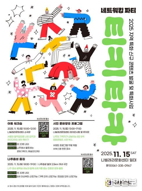 나주문화재단은 오는 11월 15일 나빌레라문화센터 일대에서 ‘네트워킹 파티: 티키타카’를 열고 지역 예술 생태계의 연결과 교류를 확대한다고 12일 밝혔다.
