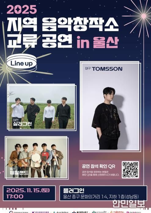 한민일보 서울포커스 기자 | 울산 중구문화의전당에서 운영하는 울산음악창작소가 오는 11월 15일, 11월 16일 오후 5시 성남동 플러그인(문화의거리 14)에서 ‘2025 지역 음악창작소 교류 공연 in 울산’을 개최한다.