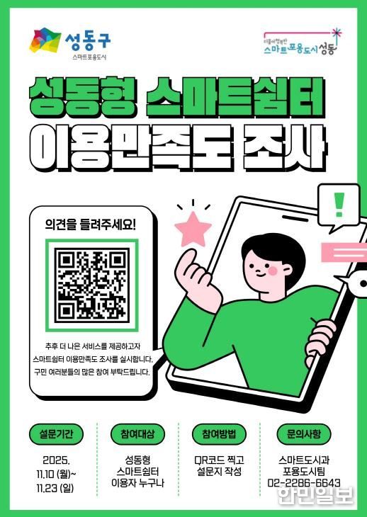시범 도입한 AI 기반 플랫폼은 ‘성동형 스마트쉼터 만족도 조사’에 처음으로 적용된다. 설문조사는 11월 10일부터 23일까지 2주간 진행되며, 성동형 스마트쉼터 이용 만족도, 향후 스마트쉼터 활성화 방안 및 창의적인 아이디어를 수렴하는 것에 중점을 두고 있다. 성동구 누리집(홈페이지), 관내 스마트쉼터, 동주민센터 등에 게시된 정보무늬(QR코드)를 통해 설문에 참여할 수 있다.