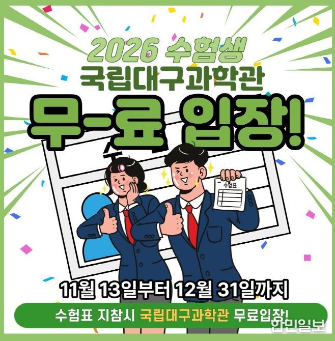한민일보 서울포커스 김봉순 기자 | 국립대구과학관은 2026학년도 대학수학능력시험을 마친 수험생들을 위해 오는 11월 13일부터 12월 31일까지 수험생 무료입장 혜택을 제공한다.