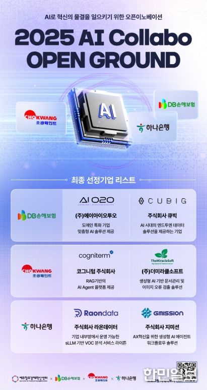 한민일보 서울포커스 임철현 기자 | 제주창조경제혁신센터(대표이사 이병선, 이하 제주센터)는 DB손해보험, 조광페인트, 하나은행과 함께 추진하는 특화산업 오픈이노베이션 ‘2025 AI 콜라보 오픈그라운드 프로그램’을 통해 최종 6개 스타트업을 선정하고, 기술 테스트와 솔루션 개발을 통해 실질적인 사업화 협력에 나선다.