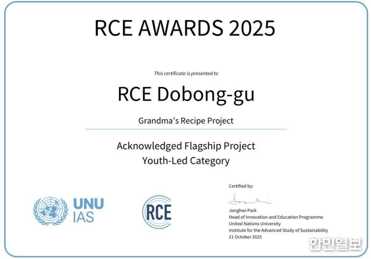 한민일보 서울포커스 김봉순 기자 | 서울 도봉구가 ‘2025 RCE 어워드’(RCE Award)에서 ’우수 프로젝트‘(Acknowledged Flagship Project) 상을 수상했다.