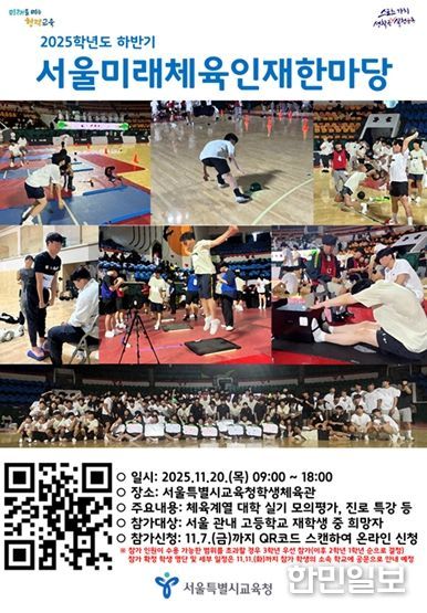 한민일보 서울포커스 국용호 기자 | 서울특별시교육청은 체육계열 대학 진학을 희망하는 학생들을 지원하기 위해 수능 직후부터 '2025년 서울특별시교육청 체육계열 대학 정시 진학 설명회'(11월 18일, 서울고)와 '2025학년도 하반기 서울미래체육인재한마당'(11월 20일, 서울특별시교육청학생체육관)을 연이어 개최하며 체육계열 진학지도 집중 지원 프로그램을 운영한다.
