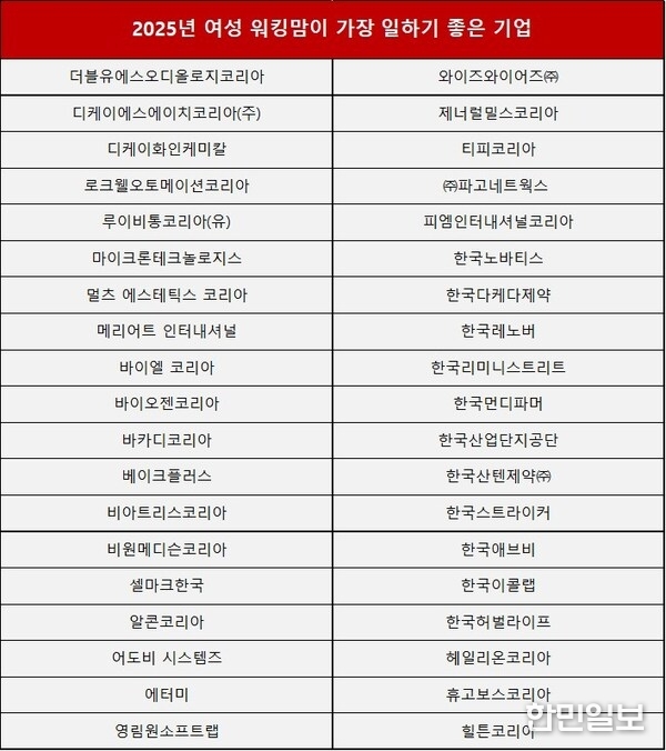 2025년 대한민국 여성 워킹맘이 일하기 좋은 기업에 선정된 기업들은 여성 워킹맘이 일하기 좋은 조직문화와 제도를 조성해 왔으며, 이를 통해 기업의 생산성과 직원의 만족도를 높이는 데 성공했다. 이번 '2025년 대한민국 여성 워킹맘이 일하기 좋은 기업'에 선정된 기업들은 아래와 같다.