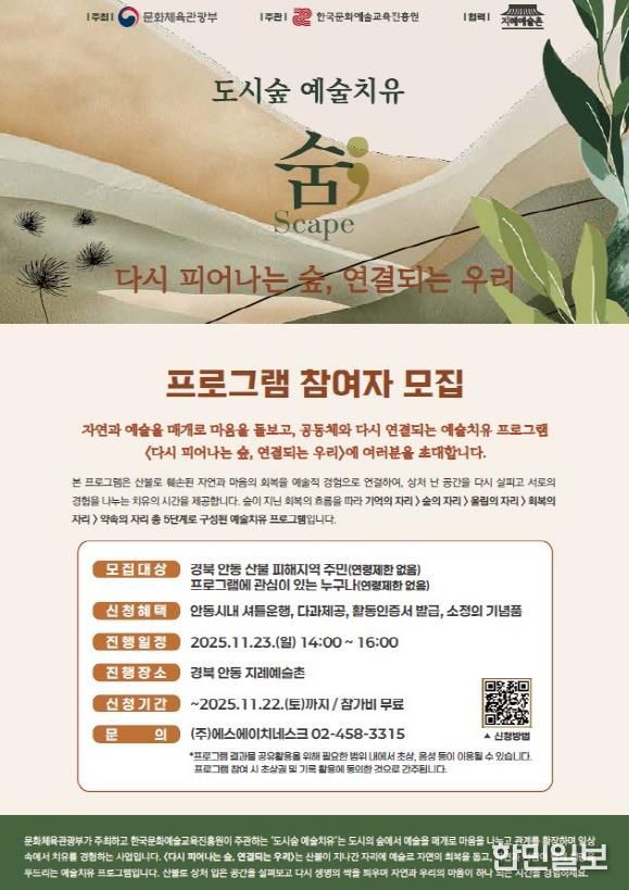 한국문화예술교육진흥원 관계자는 “이번 프로그램은 산불 피해로 상처 입은 숲을 다시 일으켜 세우기 위한 마음을 모으는 자리”라며, “자연과 예술이 함께하는 특별한 경험을 통해 시민들이 회복과 위로의 시간을 갖게 되길 바란다”고 말했다.