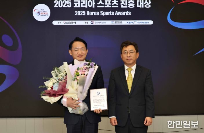 한민일보 서울포커스 백진욱 기자 | 김찬진 인천 동구청장이 지난 18일 서울 종로구 동아미디어센터에서 열린 ‘2025년 코리아 스포츠진흥 대상’리더 부문에서 대상을 수상했다.