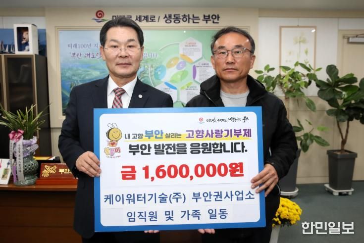 한민일보 서울포커스 김용택 기자 | 부안군은 지난 18일 케이워터기술㈜ 부안권사업소 임직원과 가족들이 고향사랑기부금 160만 원을 기탁했다고 밝혔다.
