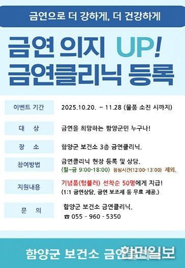 한민일보 서울포커스 김서윤 기자 | 함양군 보건소는 지역 주민들의 금연 실천을 지원하기 위해 진행 중인 ‘금연 의지를 UP! 금연클리닉 등록 이벤트’를 오는 11월 28일까지 연장 운영한다고 밝혔다.