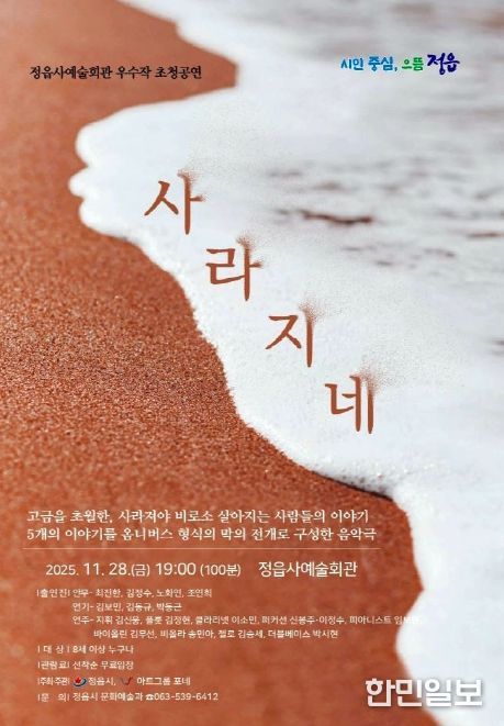 한민일보 서울포커스 김용택 기자 | 정읍시가 오는 28일 오후 7시 정읍사예술회관에서 음악과 연극, 무용을 결합한 창작 음악극 ‘사라지네’를 무대에 올린다.